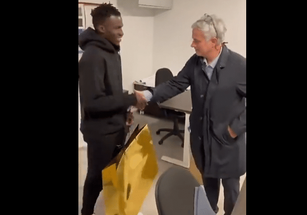 今天,穆里尼奥也遵守了自己的承诺,买上了这双球鞋并亲自交到吉安手里,吉安则拥抱并感谢了穆帅。