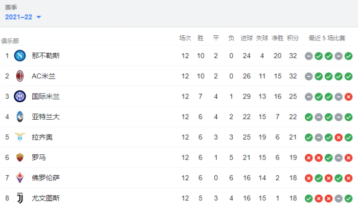 12轮过后,那不勒斯和AC米兰仍保持不败,他们也是欧洲五大联赛仅有的两支仍在联赛中没输球的球队。两队同积32分,那不勒斯因净胜球优势排名第一,米兰屈居第二。