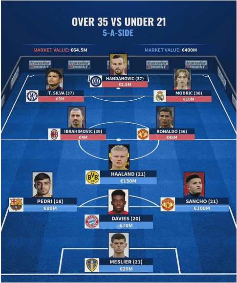如图,35岁以上的最佳五人阵容是门将位置上是37岁的门将汉达诺维奇;后卫是37岁的蒂亚戈席尔瓦和37岁的莫德里奇,前锋是40岁的伊布(伊布刚刚过完40岁生日)和36岁的C罗。而21岁以下最佳五人阵,门将位置上是21岁的梅利耶;后卫是20岁的戴维斯,中场是21岁的桑乔和18岁的罗德里,而前锋线上是21岁的哈兰德。不得不说,这两套阵容的球员都是非常出色的球员。
