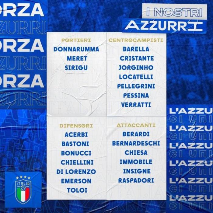 中场:巴雷拉(国米)、克里斯坦特(罗马)、若日尼奥(切尔西)、洛卡特利(尤文)、洛伦佐-佩莱格里尼(罗马)、佩西纳(亚特兰大)、维拉蒂(巴黎圣日耳曼)