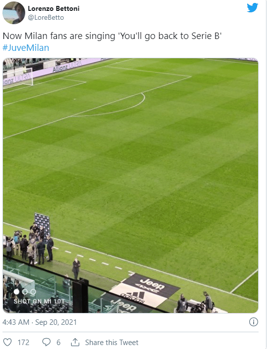 贝托尼表示,今天有511名米兰球迷随队出征,赛后他们对着发怒的阿莱格里以及默默离场的尤文球迷高唱道:“你们就要回去意乙了。”