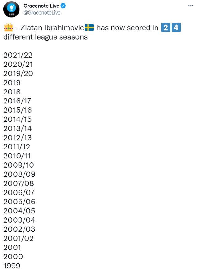 据统计,伊布从1998-99赛季开始,直到2021-22赛季,每个赛季都取得了进球,已经连续24个赛季收获进球。