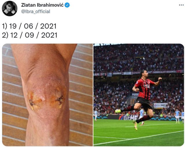 赛后,伊布晒出两张图片,一张是2021年6月19日自己膝盖手术后的伤口,另一张就是今天凌晨进球后自己庆祝的照片。
