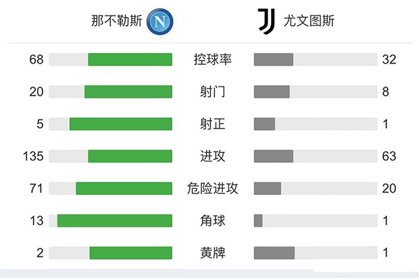 全场比赛结束,那不勒斯2-1尤文图斯。