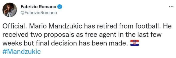 罗马诺:曼朱曾收到2份报价,但他还是选择退役