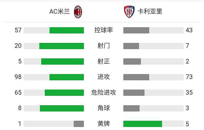第23分钟,AC米兰策动攻势,吉鲁禁区右侧接到迪亚斯直塞,左脚直接打门,拉杜诺维奇扑救不及,AC米兰3-1卡利亚里。