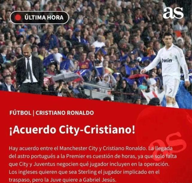 而曼城方面则不想为葡萄牙巨星支付这笔费用,因此这笔交易实现的可行性将会是球员交换。目前尤文图斯与曼城的焦点在于将哪名球员纳入交易:曼城方面希望放走斯特林,而尤文图斯希望得到热苏斯。