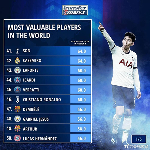根据德国足球转会网在2020年4月更新的最新身价,C罗以6000万欧元位列国际足坛第46位,不过前50的榜单中C罗是年龄最大的球员。