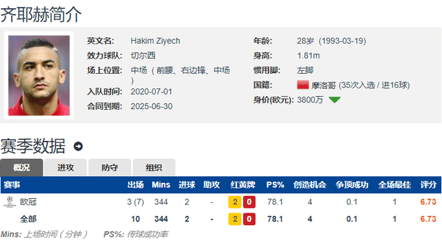 现年28岁的摩洛哥国脚齐耶赫,上赛季一共为切尔西在各项赛事中出战了39场比赛,打入了6个进球,有4次助攻,发挥未达预期。