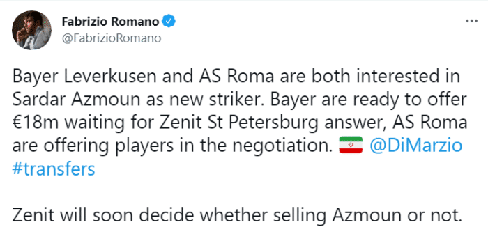勒沃库森和罗马都有意签下阿兹蒙,勒沃库森已经为阿兹蒙向泽尼特报价1800万欧元,现正在等待答复,而罗马方面希望将其他球员加入这笔交易。