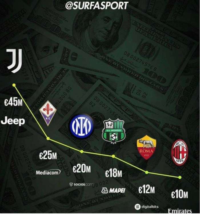 如图,尤文的胸前赞助商是JEEP,他们的赞助费是每年4500万欧元;而排名第二的佛罗伦萨,他们的赞助商media每年给球队2500万欧元的赞助费。第三的国米,刚刚官宣SOCIOS成为球队的赞助商,每年赞助费是2000万欧元,而萨索洛的赞助商Mapei每年给球队1800万欧元的赞助费,而随后是罗马,他们的新赞助商每年给罗马1200万欧元的赞助费,当然罗马的是赞助费是浮动的,球衣销量高了,赞助费会上浮。而意甲豪门米兰的赞助费只排名第六,每年1000万欧元。