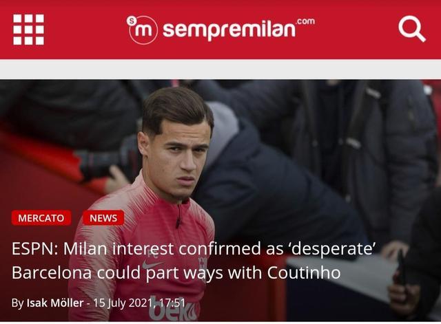 此前,米兰一直在转会市场上寻求一位前腰,因此库蒂尼奥就成了米兰的目标。
