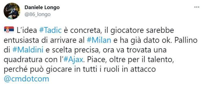 此前,根据知名转会专家迪马济奥报道,米兰已经与塔迪奇有了接触,他们随后要与阿贾克斯谈判。