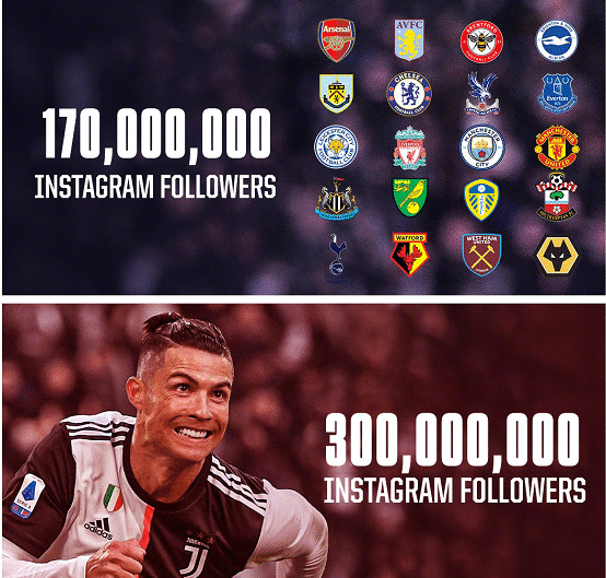C罗INS粉丝数比英超二十队总和还要多1.2亿!这就是C罗的魅力!