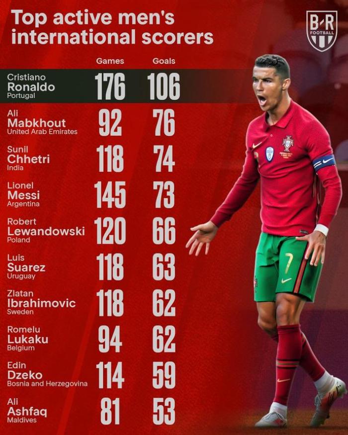 现役国家队射手榜: C罗176场106球遥遥领先