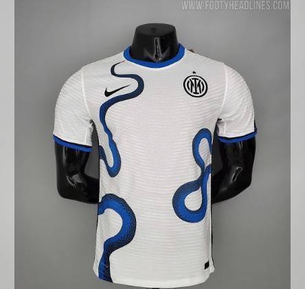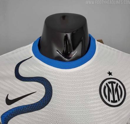 24直播网讯 今日,知名的足球装备网站Footy Headlines发布了国米在2021-22赛季的客场球衣照片,这件白色的球衣致敬了经典的蓝蛇设计。