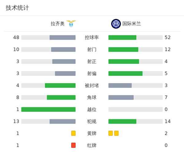 第40分钟,拉齐奥后场出现失误,马鲁西奇传球直接被劳塔罗抢断,后者突入禁区过掉门将,随后左脚攻门得手,国际米兰1-0拉齐奥。