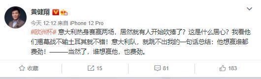 黄健翔:“意大利热身赛赢两场,居然就有人开始吹捧了?这是什么居心?我看他们揭幕战不输土耳其就不错!意大利队,就跳不出我的一句话总结:他想赢谁都费劲!———当然了,谁想赢他,也费劲。 ”