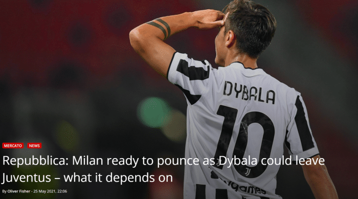 报道指出,如果恰尔汗奥卢今夏离队,那么米兰将尝试引进迪巴拉,他们现在正在关注这位阿根廷球员的动态。