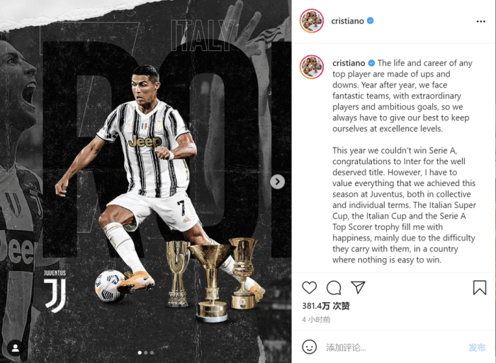 C罗ins发文总结赛季: 我不追纪录, 纪录追逐我