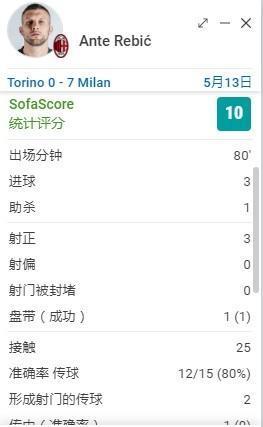 据sofascore统计,雷比奇本场出场80分钟收获3球1助,获得完美的10分。而在另一评分平台whoscore也是10分。