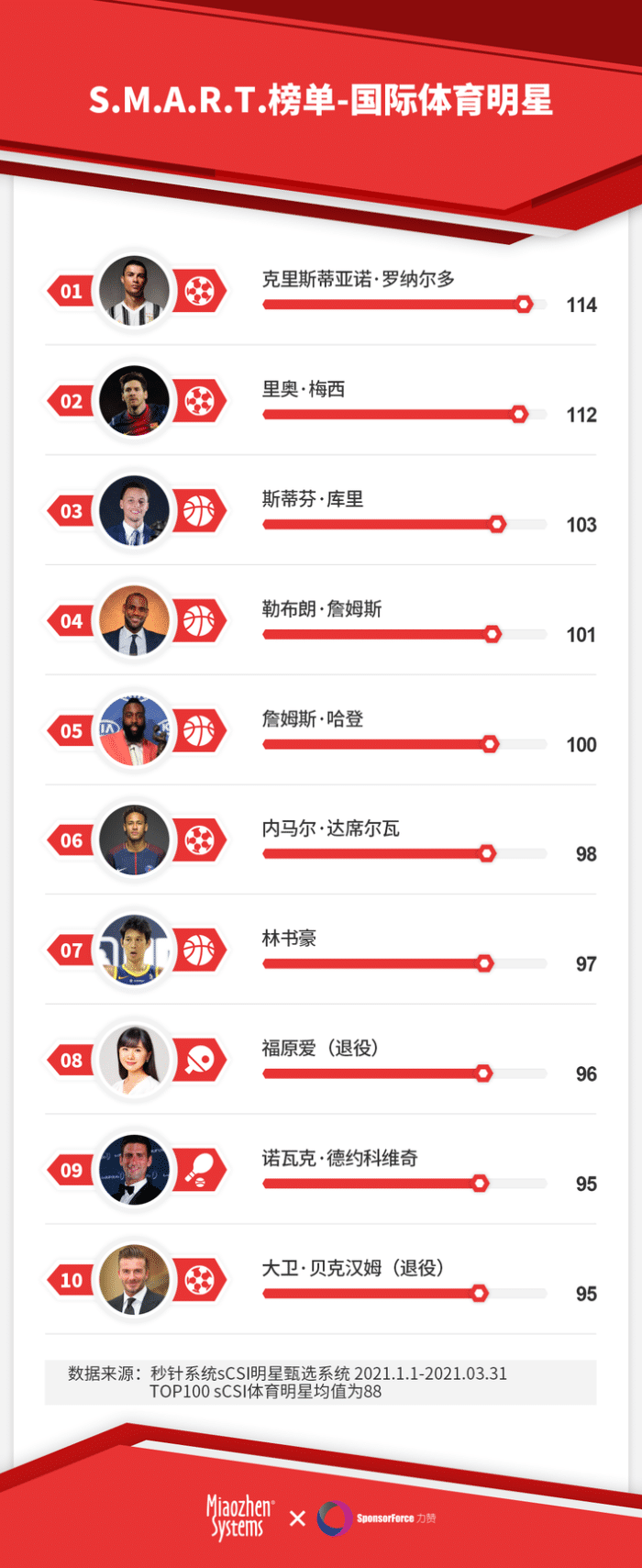 基于秒针系统sCSI体育明星甄选系统*及SocialMaster社交数据库,结合大数据、营销、体育领域顶级专家的意见