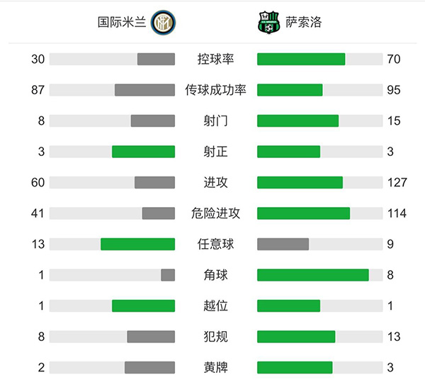 全场比赛结束,国际米兰2-1萨索洛。
