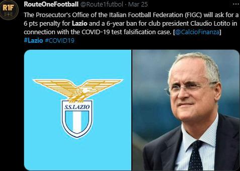 24直播网讯北京时间3月27日,据官方消息称,由于去年新冠病毒检测结果反复事件,拉齐奥主席洛蒂托将被禁止参与足球活动7个月,队医Fabio Rodia和Ivo Pulcini也同时被禁止在未来12个月参与足球活动,拉齐奥俱乐部也将收到15万欧元的处罚。