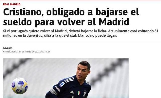 《阿斯报》透露,皇马方面也确实在考虑引进C罗的可能性,但最大的障碍并不是转会费,而是在于C罗的年薪。C罗目前在尤文图斯的年薪为3100万欧元,皇马自然无法给他提供这样的薪水。《阿斯报》透露,皇马最多能提供给罗总裁2500万欧元,这也已经是皇马队内最高薪水,但和在尤文图斯比,依然需要降薪600万欧。