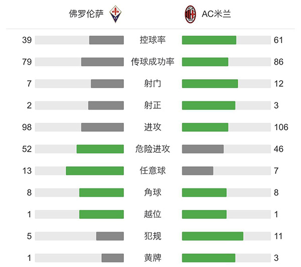 最终全场比赛结束,米兰3-2逆转佛罗伦萨,也终止了最近各项赛事的三场不胜。