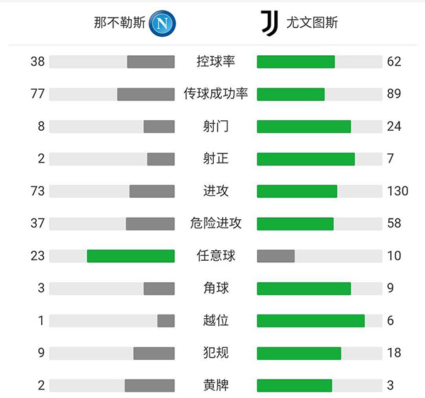 全场比赛结束,尤文客场0-1不敌那不勒斯,联赛三连胜被终结。