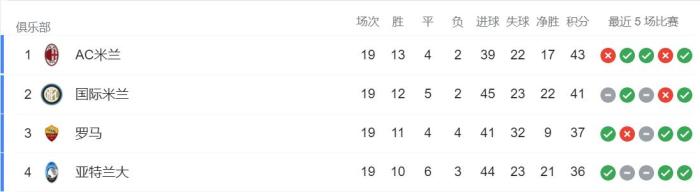 目前意甲半程已过,米兰19轮取得13胜4平2负的成绩,积43分排名第一,以2分优势力压国际米兰成为本赛季意甲半程冠军。