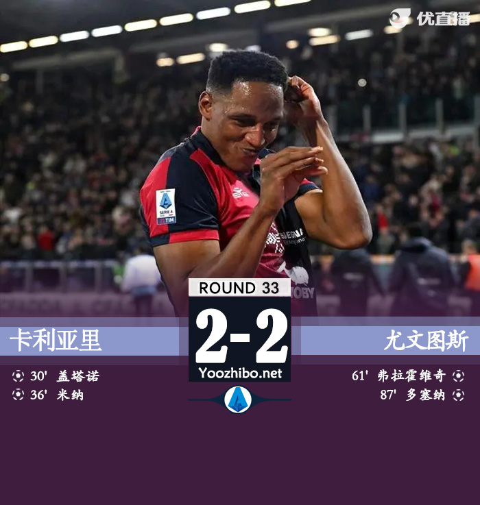 来源:24直播网04-20 05:25 24直播网讯:北京时间4月20日,意大利足球顶级联赛第33轮,卡利亚里队主场迎战尤文图斯队。上半场,布雷默、什琴斯尼连续送点,加埃塔诺、米纳点射破门,基耶萨越位在先,弗拉霍维奇进球被吹。下半场,弗拉霍维奇任意球破门,伊尔迪兹传中造成多塞纳自摆乌龙,最终,尤文客场2-2卡利亚里。