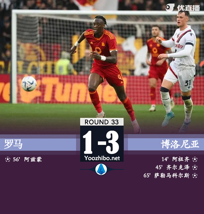 第65分钟,迪巴拉滑倒丢球,博洛尼亚中场抢断,三脚传球打穿防线!齐尔克泽送出单刀!萨勒马科尔斯冷静挑射破门!罗马1-3博洛尼亚。