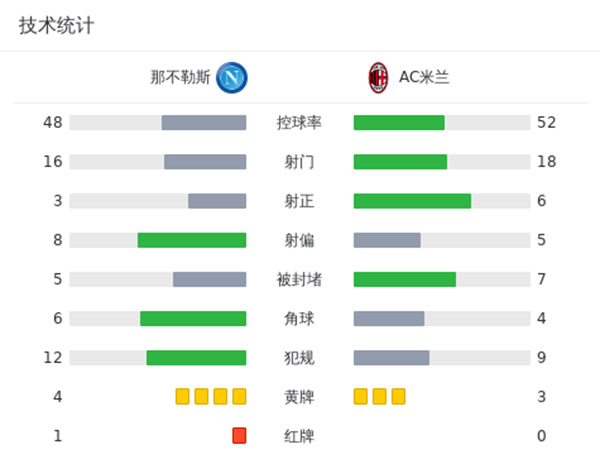 来源:24直播网10-30 07:20 24直播网讯 :北京时间10月30日意甲联赛第10轮,那不勒斯主场对阵AC米兰。上半场,卡卢卢因伤无法坚持,佩莱格里诺替补上演首秀。随后,吉鲁头球两度攻破那不勒斯球门。下半场风云突变,波利塔诺爆射扳回一城,拉斯帕多里通过任意球扳平比分。比赛尾声阶段,纳坦-德索萨犯规吃到第二张黄牌被罚下。全场比赛结束,米兰2-2战平那不勒斯,遭遇各项赛事三场不胜。