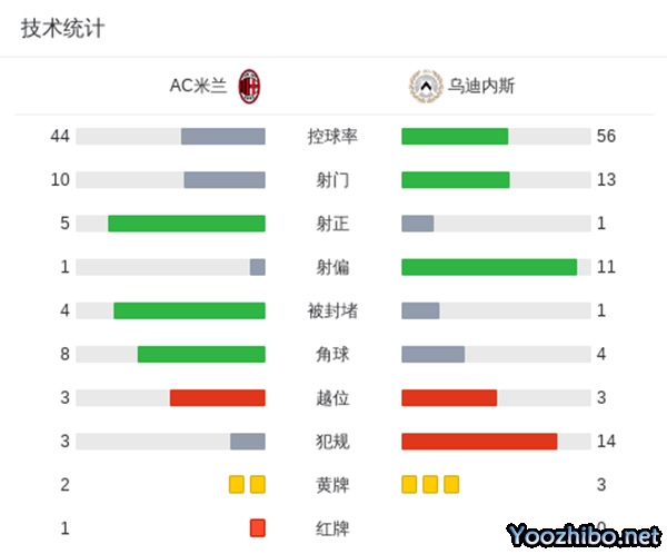 米兰1-0乌迪内斯 赖因德斯染红引争议莱奥未登场