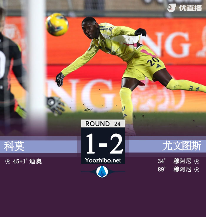 第34分钟,尤文图斯中场抢断,冈萨雷斯得球送出直塞,穆阿尼得球突入禁区小角度爆射得手,尤文图斯1-0科莫。
