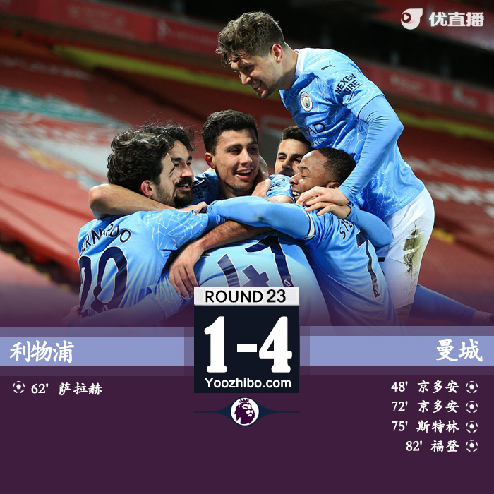 24直播网2月8日讯 北京时间2月8日凌晨0点30分,2020-21赛季英超第23轮焦点战在安菲尔德球场展开角逐,利物浦坐镇主场迎战曼城。上半场京多安失点,下半场京多安打破僵局,萨拉赫点射扳平,阿利森两次失误送礼,京多安、斯特林和福登扩大比分。最终曼城客场4-1战胜利物浦,蓝月亮豪取各项赛事14连胜,红军主场遭遇三连败。积分榜方面,曼城积50分继续领跑,利物浦积40分仍居第4名。