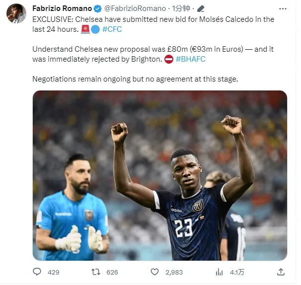 罗马诺报道称,两家俱乐部仍在谈判中,双方没有达成任何协议。据Metro报道,布莱顿对凯塞多的估价超过1亿英镑。