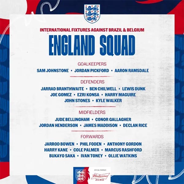 来源:24直播网03-19 15:4124直播网讯 北京时间3月15日,英格兰主教练索斯盖特公布了欧洲杯前最后两场国际友谊赛的25人大名单。