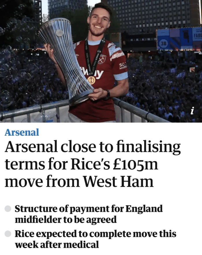 早在上个月末,西汉姆联便已经接受了阿森纳对赖斯1.05亿英镑的报价。而唯一竞争者曼城已经表示不会匹配该报价,并确定退出。如今经过多日的周旋后,两家俱乐部终于在固定转会费支付时间方面,达成一致。西汉姆联选择了妥协,此前他们一直坚持1亿镑分两期支付,但如今铁锤帮已经同意24个月内分三期支付。