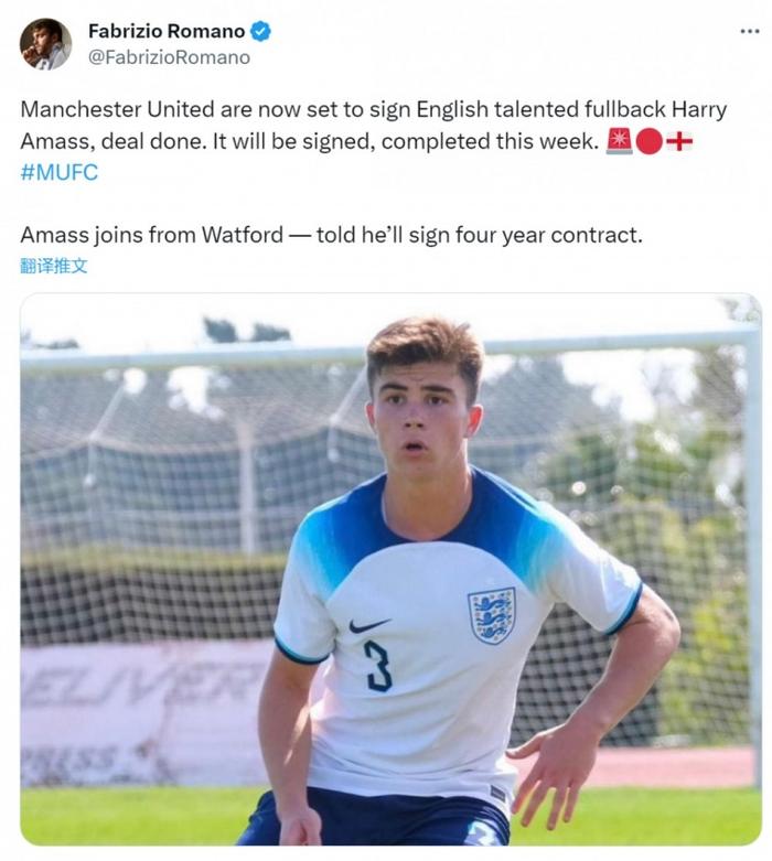 24直播网讯06月27日据The Athletic报道,曼联已经同意签下沃特福德的16岁的左后卫哈里-阿马斯。