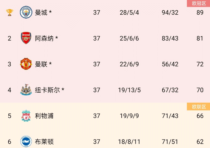 来源:24直播网05-26 09:3224直播网05月26日本赛季英超联赛只剩下一轮,随着补赛的曼联主场4-1战胜切尔西,锁定欧冠资格,这样前六名正式确定,参加下个赛季欧冠的球队是冠军曼城、亚军阿森纳和曼联、纽卡斯尔。第五名的利物浦和第六名的布莱顿参加下个赛季的欧联杯。