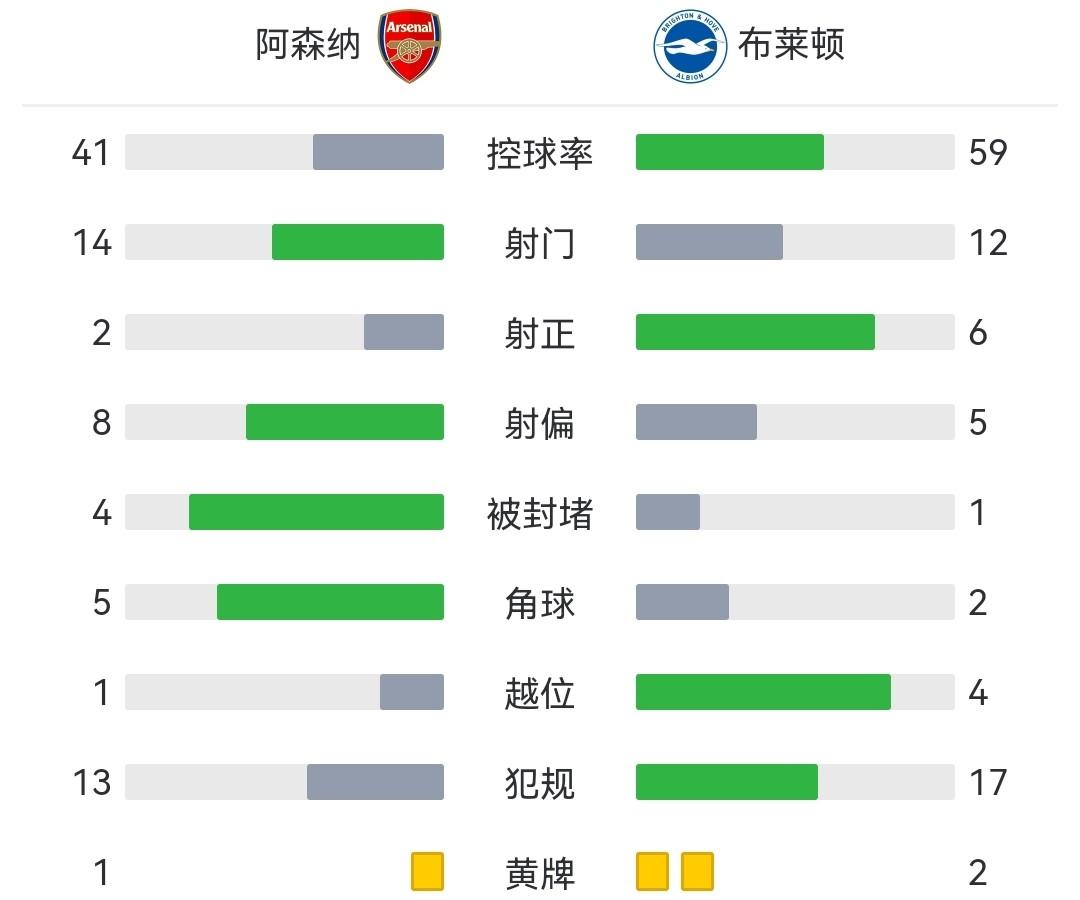全场比赛结束,阿森纳0-3布莱顿。