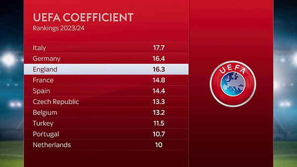 这意味着,在西汉姆淘汰弗莱堡后,接下来英超在欧足联的联赛系数排行榜上超越德甲,是概率很大的事情,这样一来,下赛季就能有多一支英格兰球队有资格参与欧冠。