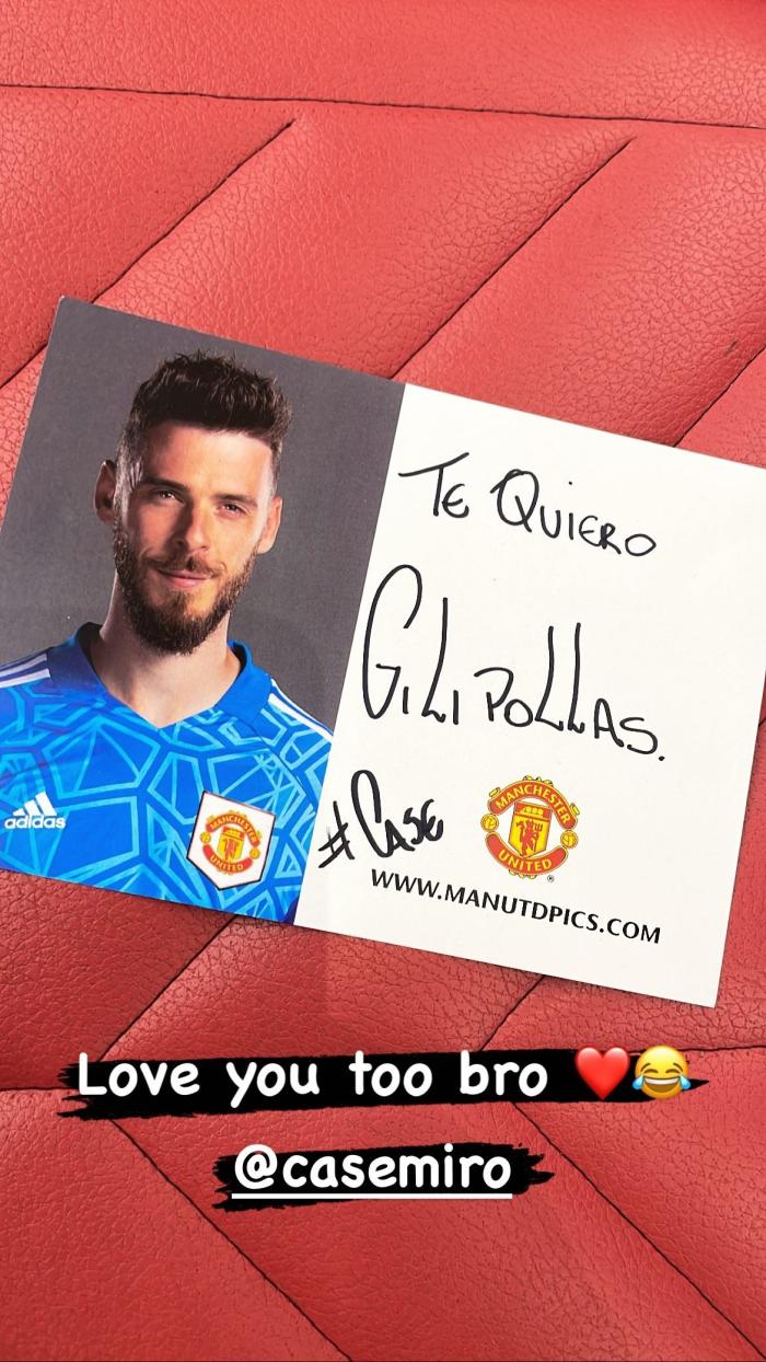 虽然曼联遭遇伤病困扰,但队内保持着积极的气氛,巴西铁腰卡塞米罗还跟门将德赫亚开玩笑,给他送了一张卡片,上面用西班牙语写着「Te Quiero Gilipollas」。Te Quiero在西语中就是我爱你的意思,但后面的Gilipollas的意思则有些不雅,是「菊花」之意。当然,这是队友间的玩笑,德赫亚将它发布在个人社交账号上,并且回应道:「我也爱你,兄弟。」