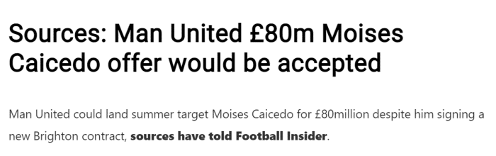 因此,预计夏窗必须给出更高报价,才可能让布莱顿同意出售,他们的理想价格可能高达1亿英镑,但曼联将尝试8000万英镑收购,消息人士称,布莱顿会接受这样的金额。