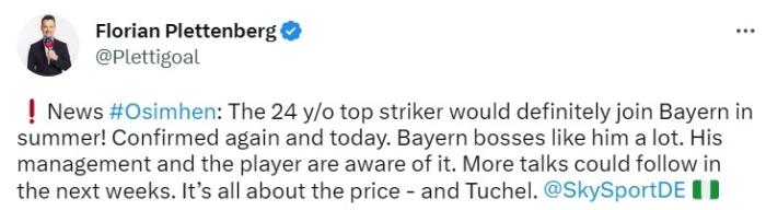 目前在德国《转会市场》上,奥斯梅恩身价高达1亿欧元。值得注意的是,奥斯梅恩也是英超豪门曼联俱乐部今夏的主要引援目标。如果奥斯梅恩基本确定加盟拜仁,那么曼联今夏补强锋线计划无疑遭遇沉重打击。
