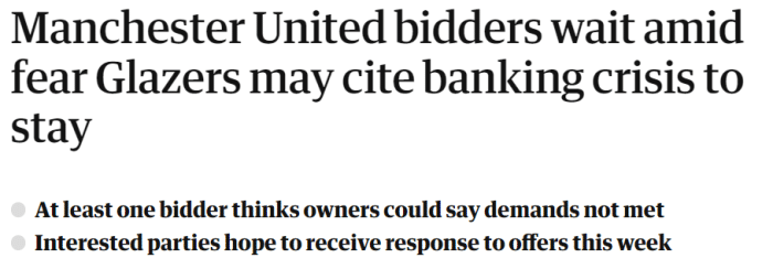 英国《卫报》报道称,曼联的竞标者希望本周收到回应,至少有一名潜在买家担心,格雷泽家族最终会以银行业的危机为由,宣布不出售。该买家认为,格雷泽六兄弟姐妹现在可以选择不出售,因为他们拥有理想的理由:银行业危机阻止了他们达到想要的价格!
