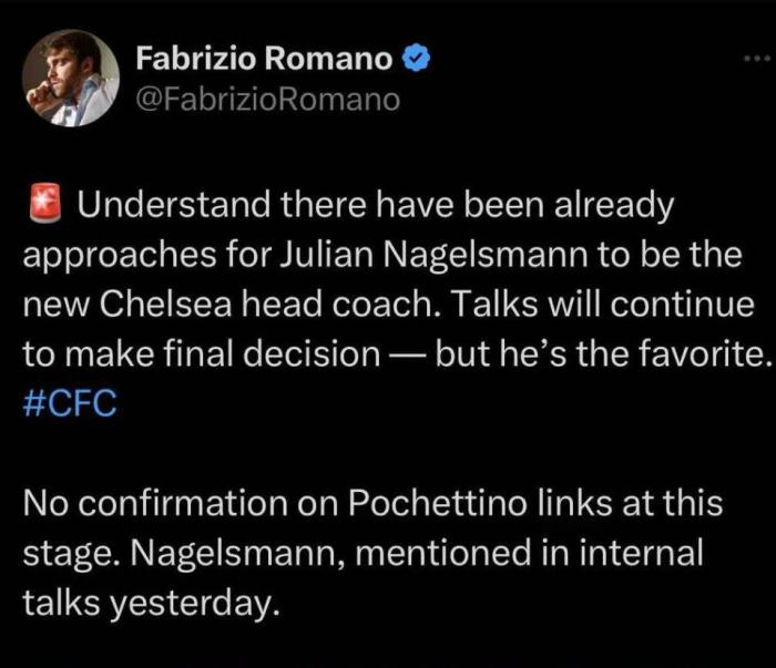 来源:24直播网04-03 17:5324直播网01月03日讯 ,英超豪门切尔西俱乐部官方宣布,英格兰籍主帅波特正式下课。而来自迪马济奥和罗马诺等知名转会专家的消息,德国少帅纳格尔斯曼成为切尔西新主帅的最热门人选。双方可能会在未来的几天内达成协议。